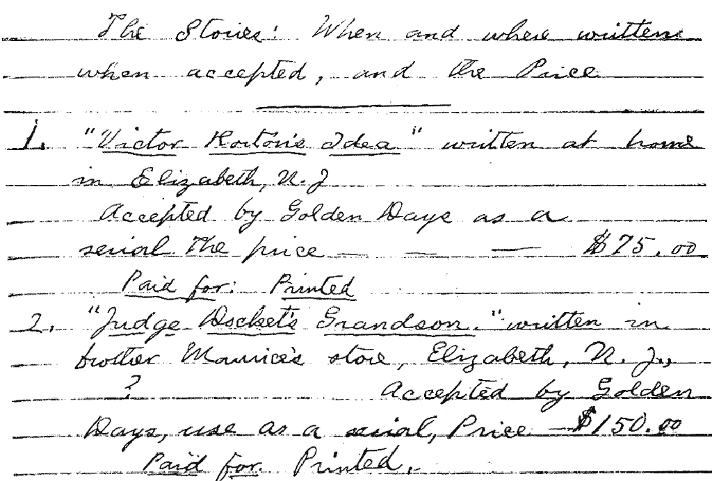 Further, this story was not written in anyone’s shop. Instead, according to his own Literary Account Book, “Victor Horton’s Idea” was written at home. At that time, it would be 24 Palmer Street, Elizabeth, New Jersey.