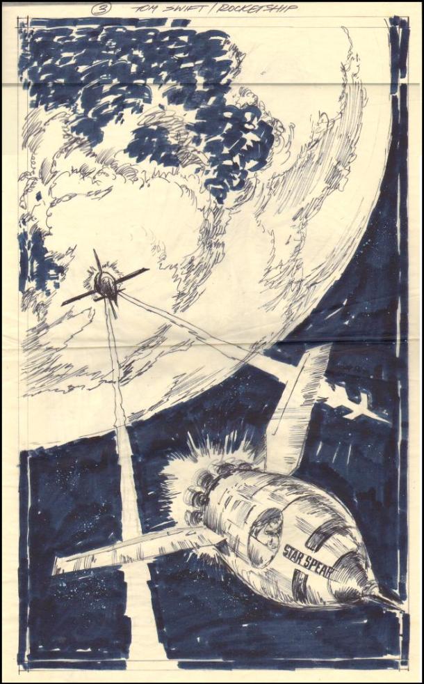 It shows Tom’s ship, the Star Spear, leaving Earth and being pursued by a rival’s rocket.