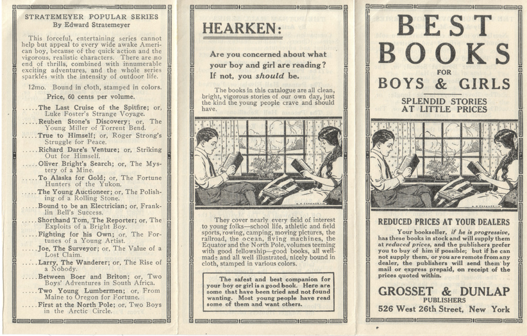 In general, however, most mailings sent out to prospective readers and buyers were similar to the three panels shown from a larger Grosset & Dunlap pamphlet from the 1910s seen below.