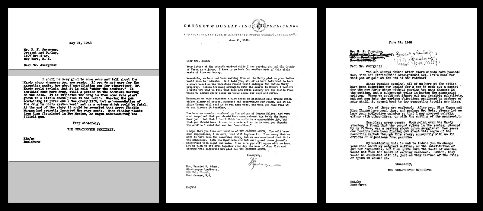 Curiously, some of these were used in older stories but were dropped as unsuitable for new stories for modern readers. For example, the Syndicate proposed a plot with drug smuggling and Grosset & Dunlap’s editors declined it. Part way through the exchange of letters the Syndicate realized that opium smuggling had been used in one of the original three Hardy Boys volumes.