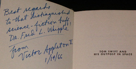 Presentation signature from Victor Appleton II to Dr. Fred L. Whipple, an expert on comets who was a consultant on Tom Swift and the Mystery Comet (1966).